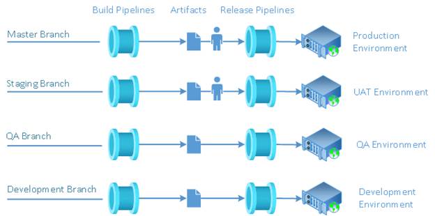 The CI/CD process is fully automated for the Development and QA branches. A dedicated user runs release pipelines for the Staging and Master branches.