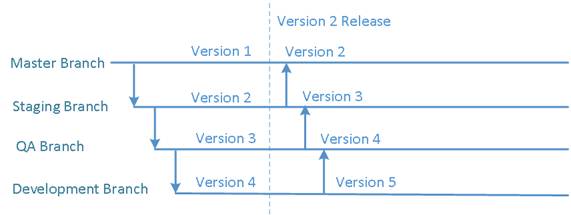 For example, the Staging branch is one level down relative to the Master branch, meaning it targets the next version of the software product, which is version 2. The QA branch is one level below the Staging branch, meaning it targets version 3 of the software product. The Development branch is one level below the QA branch, meaning it targets version 4 of the software product.