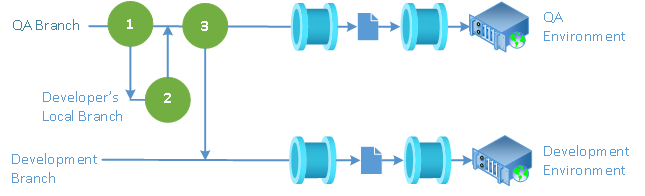 The bug fixing process on the QA branch also follows the GitHub Flow Branch strategy, consisting of the same sequence of branch (1) / merge (2) event pairs, but with one additional step (3) – merging the entire QA branch down into the Development branch after the fix is complete to incorporate the fix into future development:
