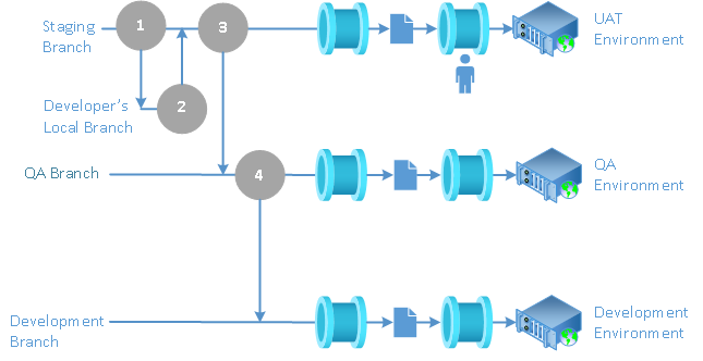 The bug fixing process in Staging branch also follows the GitHub Flow Branch strategy, consisting of the same sequence of branch (1) /merge (2) event pairs, but with two additional steps – merging the entire Staging branch down into the QA branch after a fix is completed to include the fix in the version of the software product that the QA team is testing (3), and merging the entire QA branch down into the Development branch to include the fix in future development (4):