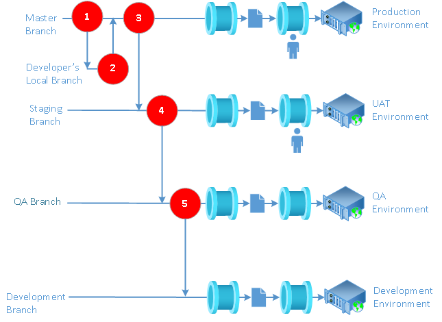 The process of fixing bugs in the Master branch also follows the GitHub Flow Branch strategy, consisting of the same sequence of branch (1) /merge (2) event pairs, but with three additional steps - merging the entire Master branch down into the Staging branch after the fix is complete to include the fix in the version of the software being tested by the UAT team (3), merging the entire Staging branch down into the QA branch to include the fix in the version of the software being tested by the QA team (4), and merging the entire QA branch down into the Development branch to include the fix in future development (5):